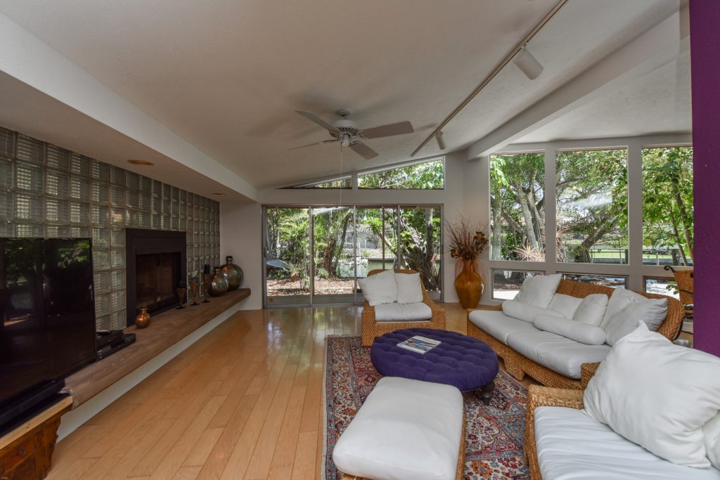 The large kitchen is open to the living areas with a wood burning fireplace and multiple sliders and expansive windows that open to a screened lanai for outdoor dining and lounging.