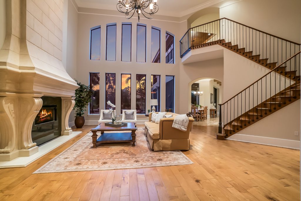 Interiors are rich in romantic details, blending soaring 22’ ceilings with open plan & vistas of the pool & emerald fairways. Entertain with grace in the grand salon complete with stunning wood staircase, wood flooring, entertainment bar & 22’ floor-to-ceiling cast stone mantle gas fireplace. Generously sized gourmand’s kitchen is equipped with expansive breakfast bar, oversized island, breakfast nook, travertine backsplash, granite counters & top-of-the-line appliances. Luxuriate in the master suite complete with private retreat that opens to the pool deck, his & her closets with custom closet systems & master bath with mini refrigerator & a built-in TV in the mirror. The 6,122 square foot residence also encompasses 3 additional ensuite guest rooms, step-up formal dining area, wine cellar, office, sitting room, theater room, game room, three car garage & more.
