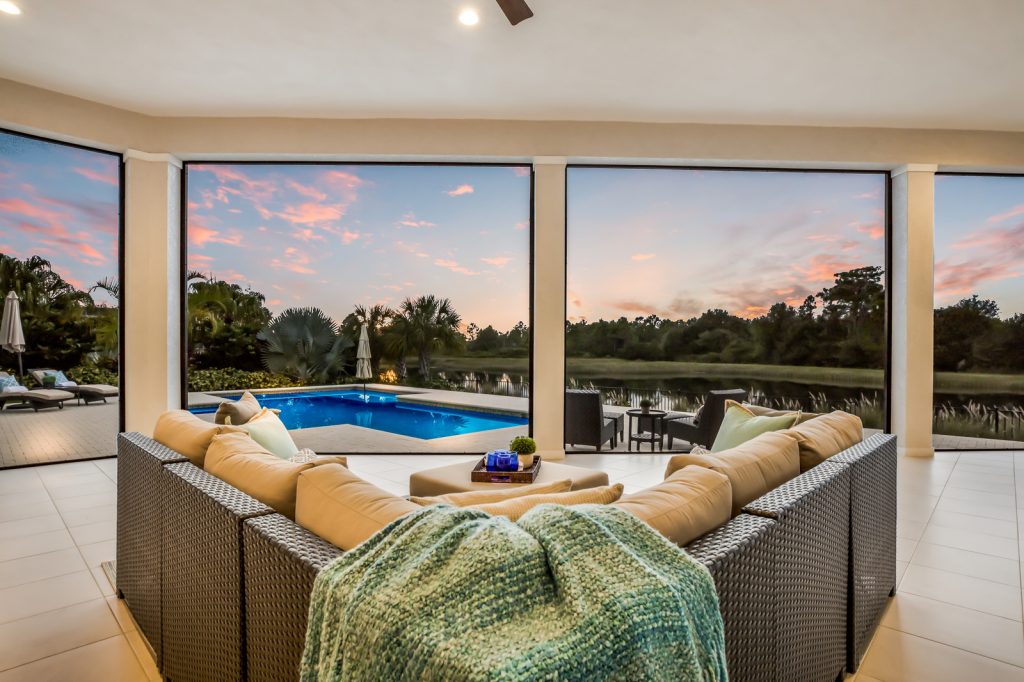 The owner's retreat was positioned on its own wing with direct access to the outdoors, dual walk-in closets and spa-like bath with separate vanities, rain shower and free standing volcanic limestone tub. Vistas continued from an oversized office that transforms into a theater room via disappearing projector screen. The outdoors boasted endless screened areas, summer kitchen, and speakers, while a bonus room opened up the outdoor living area via disappearing cornerless glass walls. The open shell stone deck with heated PebbleTec saltwater pool/spa and fully fenced yard tied it all together. Further enhancing this 4,272 sqft residence was an impressive laundry room, flex room, expanded 3-car garage, hurricane impact windows/doors, and smart house technology.
