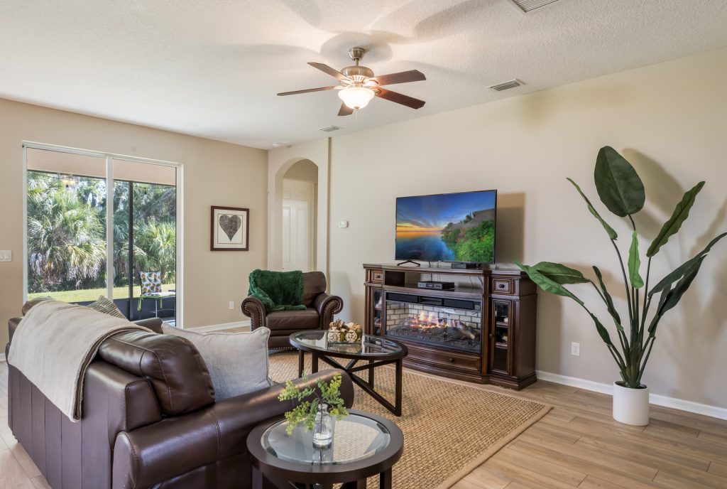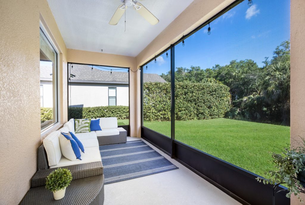 This five-bedroom residence balances open spaces for entertaining with private areas and vibrant green surroundings featuring a preserve in the distance. The great room is perfect for coming together with recently installed wood-like floors, sliding glass doors to the lanai, and an open kitchen.