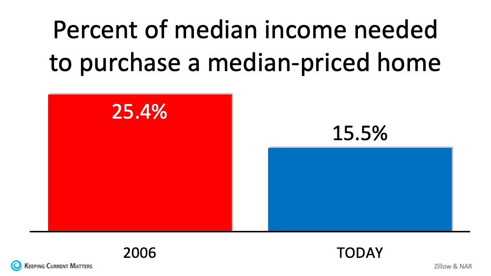 The affordability formula has three components: the price of the home, the wages earned by the purchaser, and the mortgage rate available at the time. Fourteen years ago, prices were high, wages were low, and mortgage rates were over 6%. Today, prices are still high. Wages, however, have increased and the mortgage rate is about 3.5%. That means the average family pays less of their monthly income toward their mortgage payment than they did back then. Here’s a graph showing that difference: