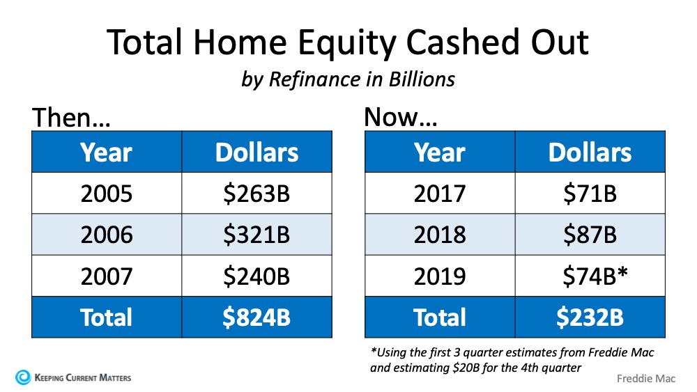 In the run-up to the housing bubble, homeowners were using their homes as a personal ATM machine. Many immediately withdrew their equity once it built up, and they learned their lesson in the process. Prices have risen nicely over the last few years, leading to over fifty percent of homes in the country having greater than 50% equity. But owners have not been tapping into it like the last time. Here is a table comparing the equity withdrawal over the last three years compared to 2005, 2006, and 2007. Homeowners have cashed out over $500 billion dollars less than before: