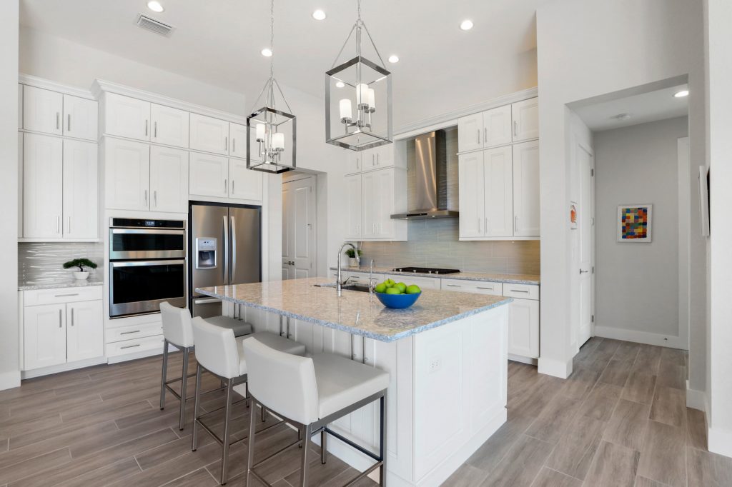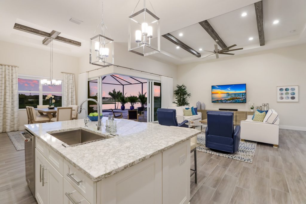 The open concept plan began with volume designer ceilings accentuated with cypress texture beams, plank tile flooring throughout, designer light fixtures, and the latest finishes fused into every room.