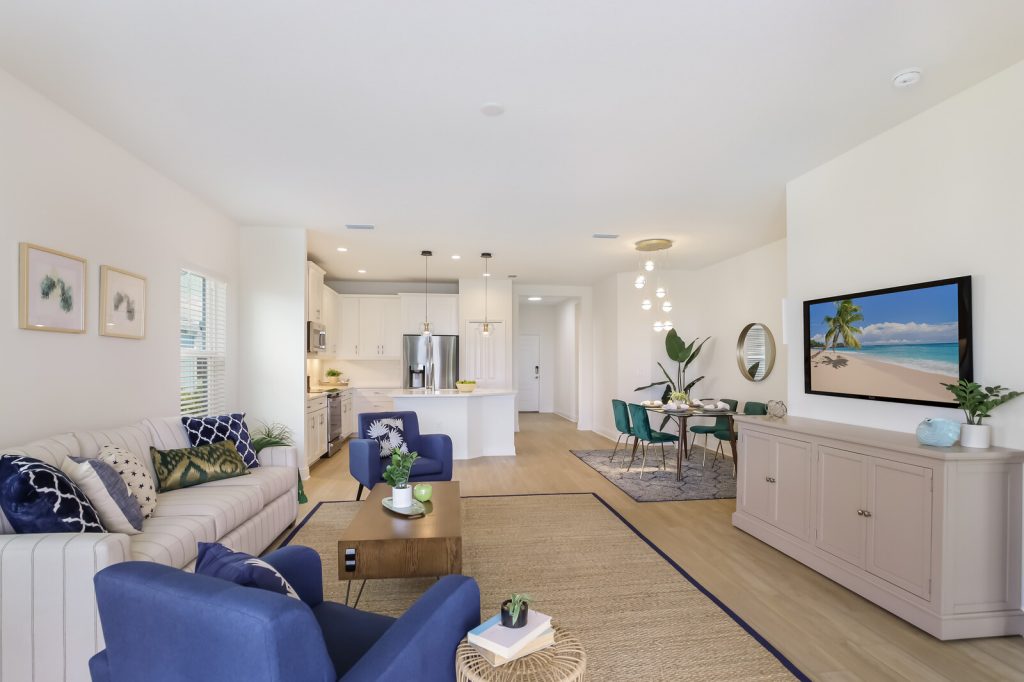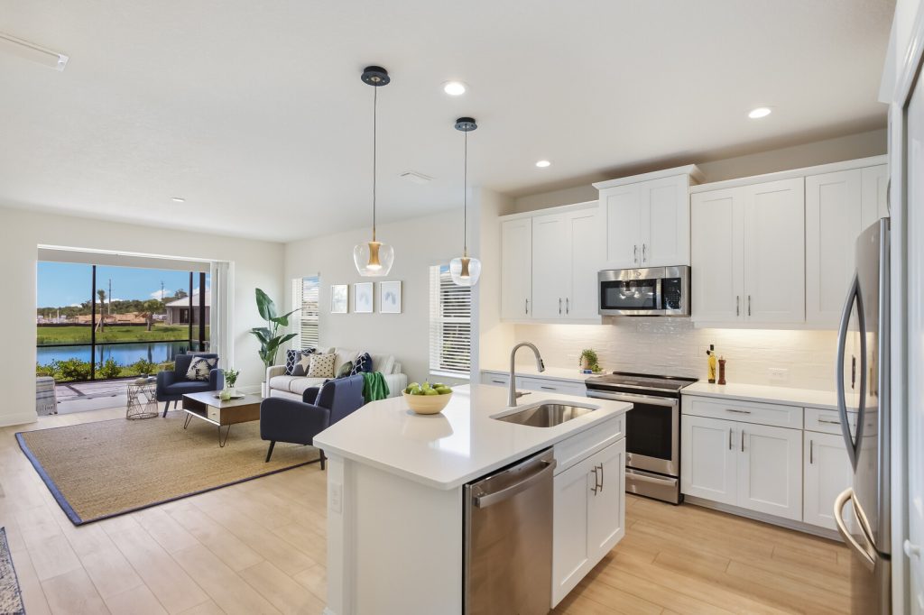 The 1,524 square foot Tidewater plan by signature builder Neal Communities is light and airy boasting luxury vinyl plank flooring and hurricane impact windows, sliders and doors throughout.
