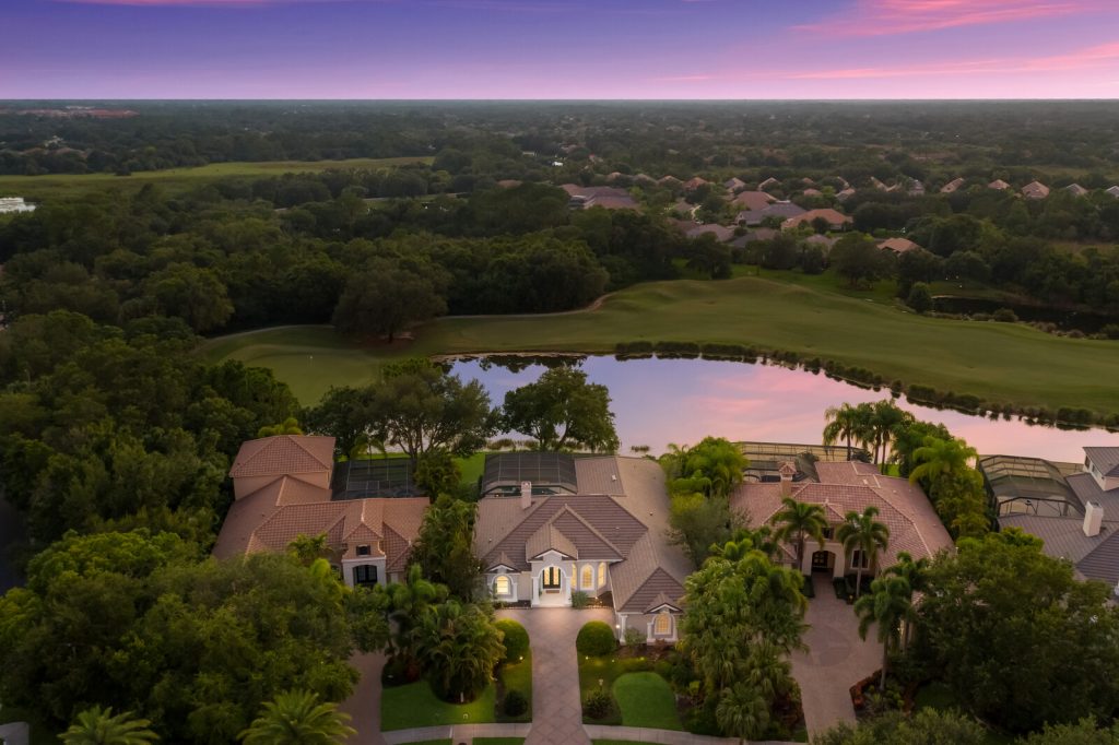 Savor captivating south westerly lake, golf course and preserve views in this beautifully appointed former model home nestled in a serene, private setting on the King’s Dunes golf course in Lakewood Ranch Country Club.