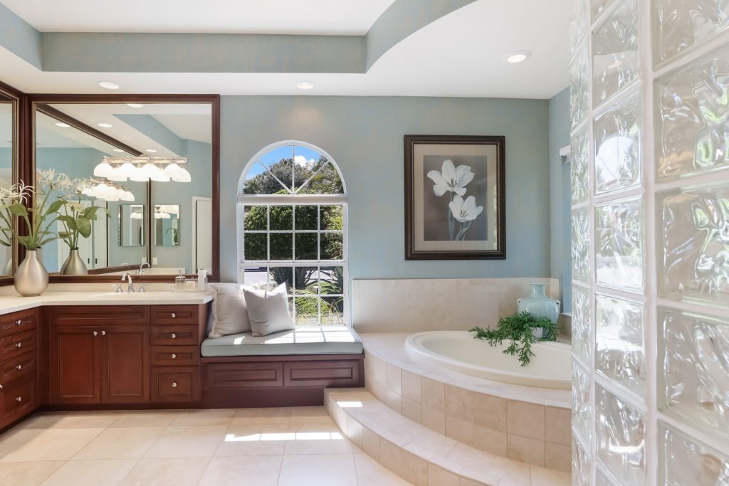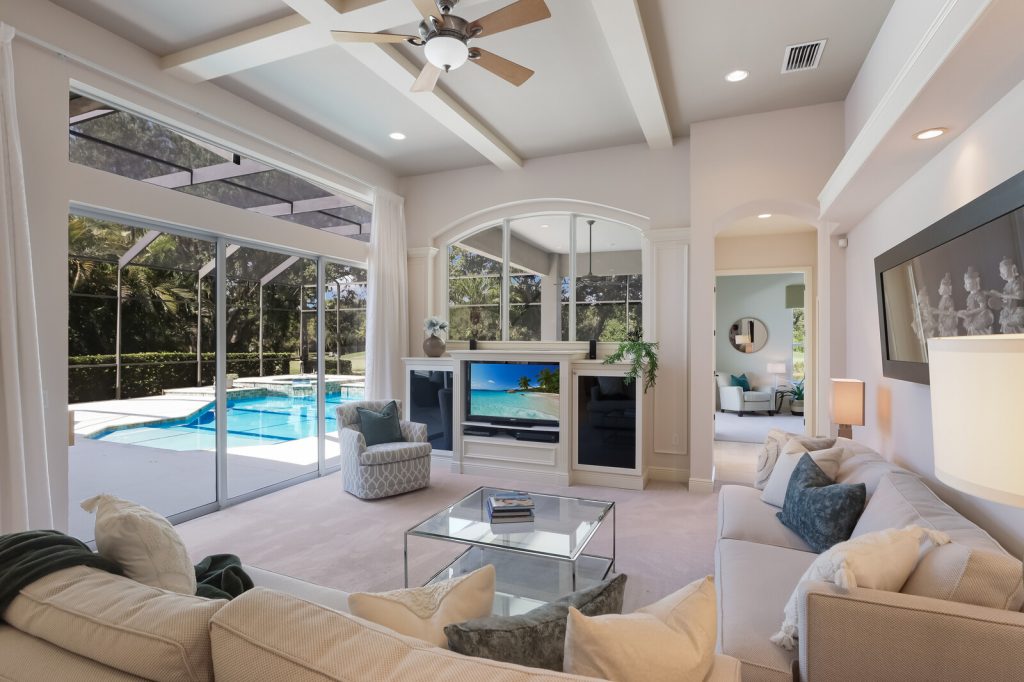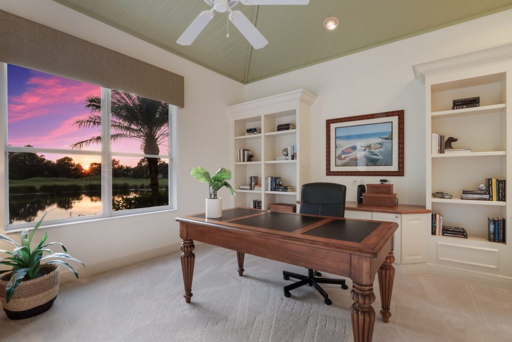 The light-filled primary bath includes separate vanities, a walk-in shower and separate tub. Overnight visitors will appreciate the private guest wing behind pocket doors, featuring one with an en-suite bath serving as double duty to the home’s pool bath, shutters, as well as new carpeting. The second guest bedroom offers multiple built-in shelves and a built-in desk station and has access to the home’s third full bath.