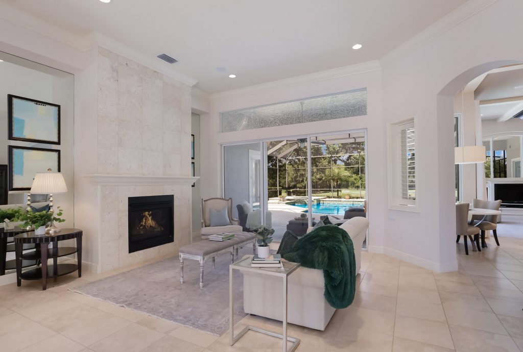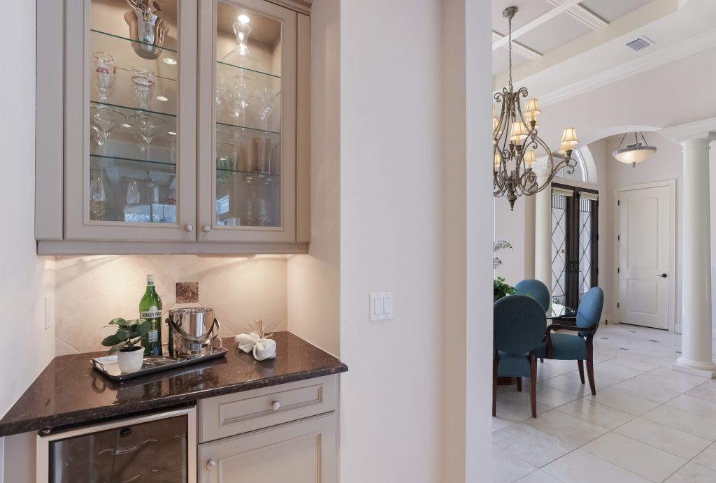 Off the kitchen is a butler’s pantry with a wine fridge connecting to a lovely formal dining room with sizable windows, infusing the space with natural light, while an equally elegant living room with gas fireplace is adorned with floor to ceiling travertine.