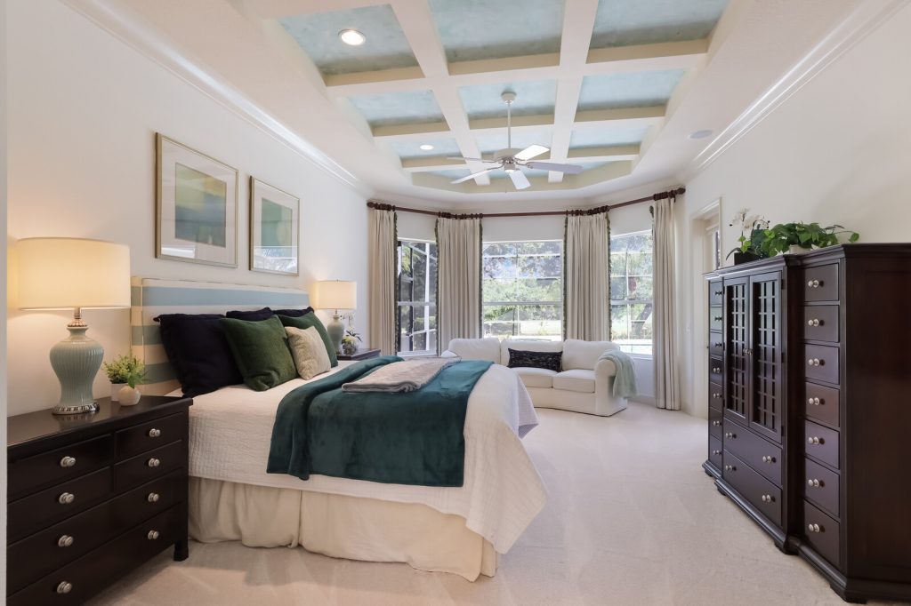 A perfectly located bonus room at the rear of the residence offers picturesque views, built-in shelves and access to the lanai. Overlooking the family room, dinette and pool is an expansive chef’s kitchen with designer ceilings and beyond suitable for gatherings and creating delectable dishes, with a gas range, abundant granite counters, island, breakfast bar and pantry.